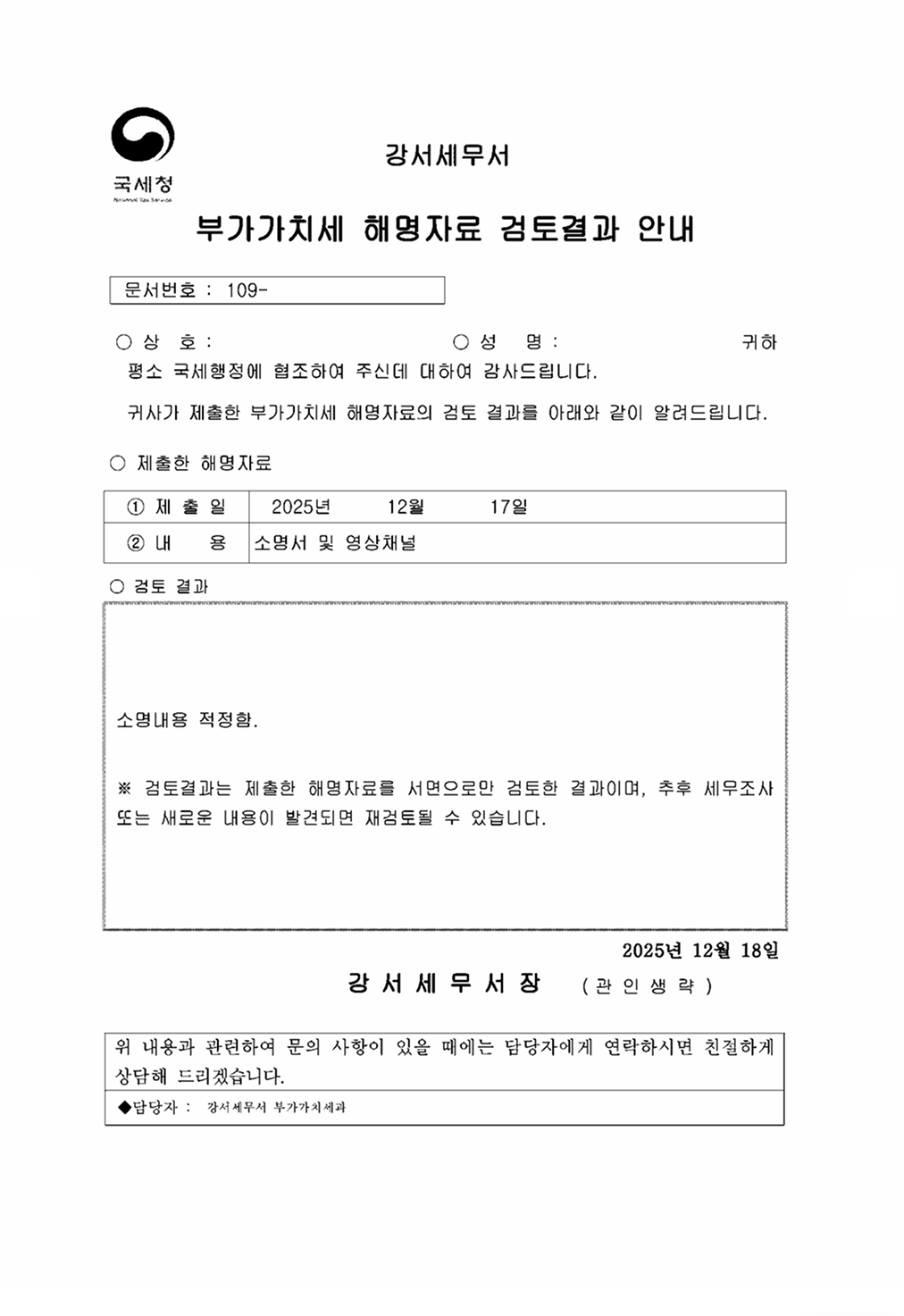 ✅ 상황 : 국세청의 부가가치세 영세율(0%) 적용 적정성 검토 및 매출 누락 의심에 따른 해명 요구